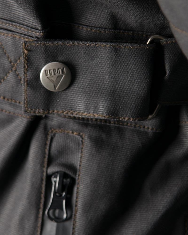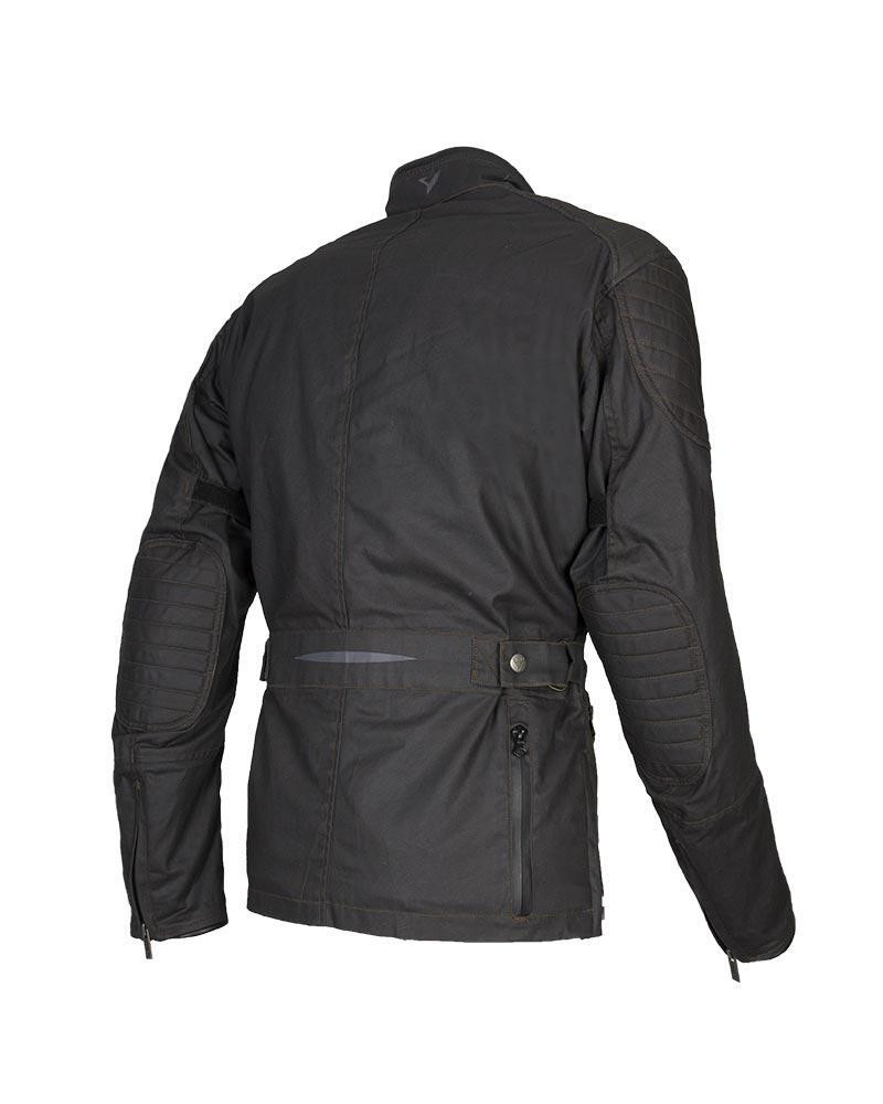 Chaqueta de moto hombre resistente fabricada en algodón encerado con cremallera metálica central YKK de doble cursor. Incluye once bolsillos exteriores y dos interiores para almacenamiento conveniente. Ajustable en la cintura para un ajuste personalizado y equipada con membrana interna impermeable HIPORA. Incluye forro interior manga larga desmontable 2 en 1 y bolsillo para protección de espalda. Ideal para condiciones climáticas variables y actividades al aire libre.