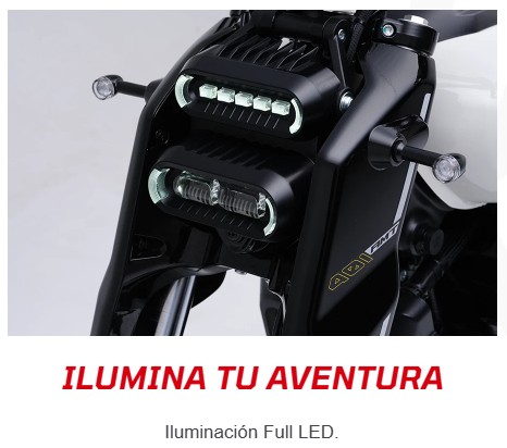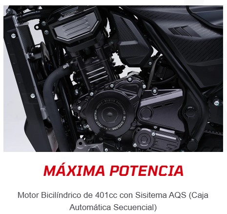 - Motor: bicilindrico, 4 tiempos, 401 cc, 8 válvulas, 45 CV, 37 NM/8000 rpm, Euro 5+, 6 velocidades, transmisión por correa, embrague automático,..