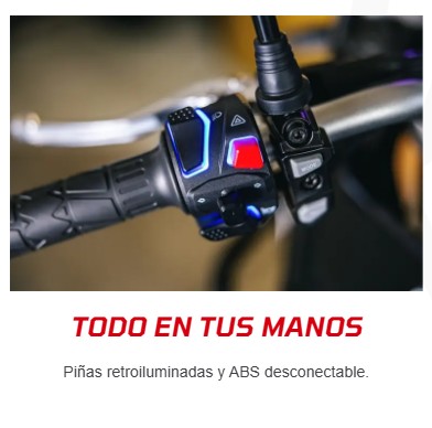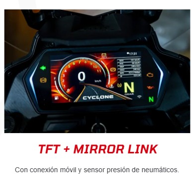CYCLONE RX6 ST: trail urbana/carretera con 70 CV de potencia y toda la electrónica para hacer tus desplazamientos cómodos y seguros. Sistemas de control de tracción y frenos: TCS + ABS. Iluminación full LED, pantalla TFT + Mirror link de 6,75”. ABS de doble canal, pinzas de frenos J.JUAN, suspensiones KYB (Kayaba), Neumáticos tubeless.