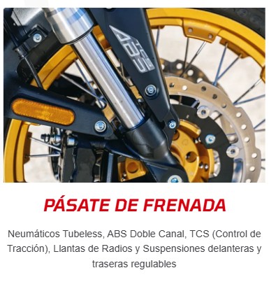 - Frenos: Delanteros/traseros: Disco, ABS. / Neumáticos: Delantero: 110/80R19; Trasero: 150/70R17.