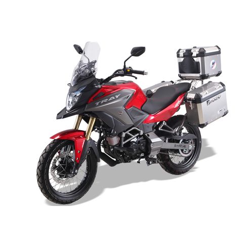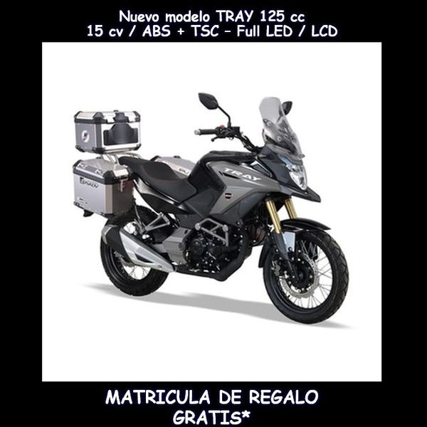 MH TRAY 125 Touring: Preciosa trail 125cc, Equipada con 3 maletas metálicas + soportes, con moderno motor de refrigeración líquida, y 15 Cv de potencia. Par motor: 11,2 Nm a 8.000 rpm. Agresivo frontal, con iluminación Full LED. Neumáticos mixtos de 17” y llantas de radio. Inyección Bosch. Panel LCD, frenos ABS Bosch de doble canal. 3 AÑOS DE GARANTÍA.*Tasas de tráfico/matrícula, embalaje/portes, pre entrega y montaje incluidas; oferta válida para vehículos en stock y matriculados antes del 30/03/2026. Colores disponibles: negro, azul, roja y blanco.