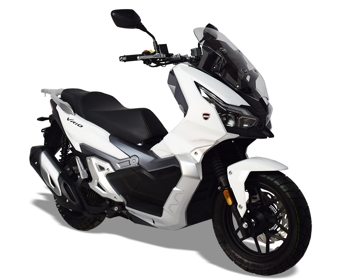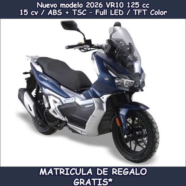 MH VR10: 125 cc, 15 CV, 4 válvulas SOHC, refrigeración líquida, 12,5 Nm/6.500 rpm. Inyección Bosch. Iluminación full LED, Frenos ABS Bosch doble canal + TSC (control de tracción) + Piñas retroiluminadas + Pantalla TFT color 7″ + Conectividad móvil “Mirrow Program”. Neumáticos mixtos: Llanta delantera 14” y trasera:13”. 3 AÑOS DE GARANTÍA.*Tasas de tráfico/matrícula, embalaje/portes, pre entrega y montaje incluidas; oferta válida para vehículos en stock y matriculados antes del 30/03/2026.