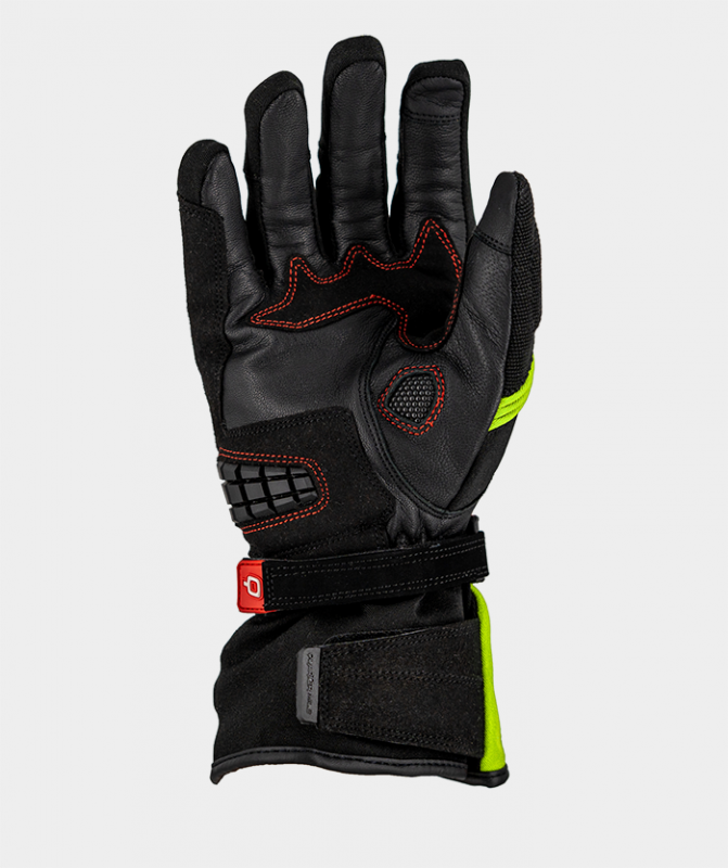 SEGURIDAD ANTE TODO Protectores en falanges, protector de nudillos TPU recubiertos en neopreno, deslizadera rígida de mayor tamaño y doble capa de piel en la palma, doble cierre de muñeca. Sin duda, detalles que un motero sabe apreciar. Uno de los mayores despliegues de seguridad para proteger la primera zona de impacto en un accidente sin renunciar a la comodidad.