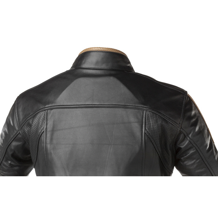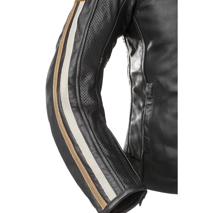 Rainers chaqueta moto piel Jaguar: Chaqueta de cuero granulada, corta y forro térmico extraíble, combina cuero perforado con dos franjas en beige y marrón en brazos, se ajusta a tus caderas fácilmente con dos correas y botones a presión.