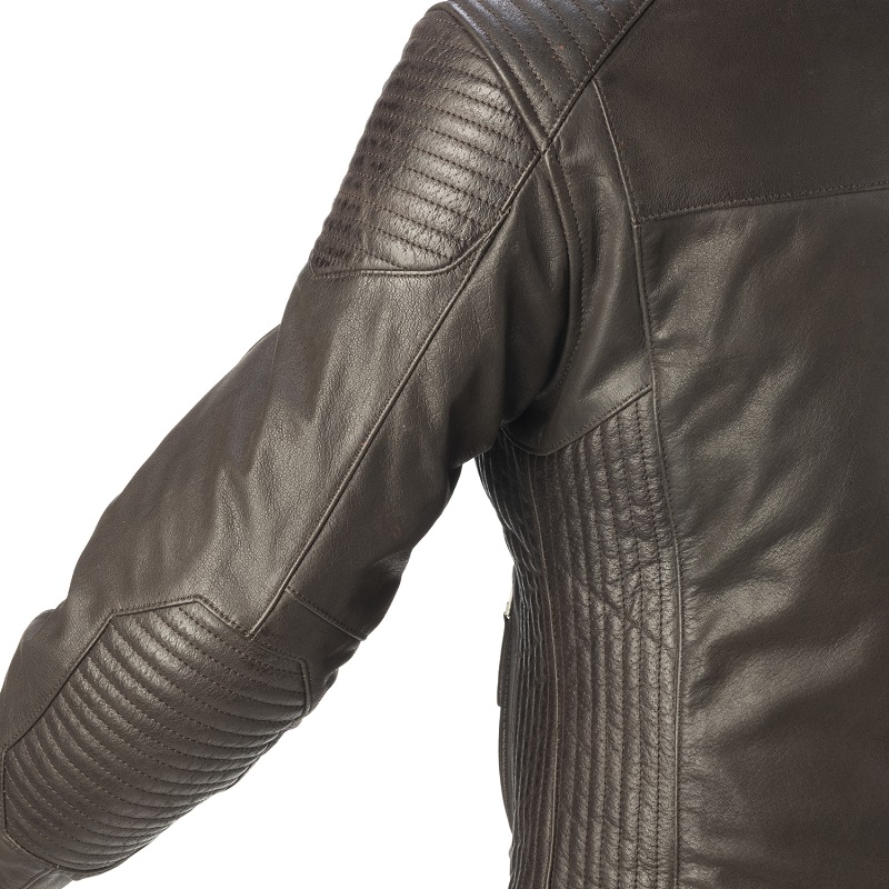 - Refuerzos acolchados exteriores de piel en codo y hombro.