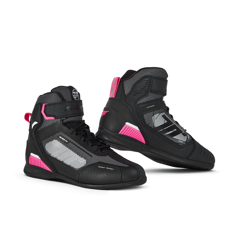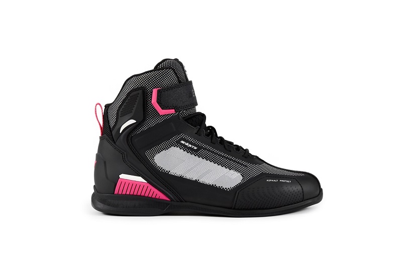 - Protección: protectores reforzados en el talón, tobillo, parte delantera del pie y palanca de cambios, además de inserciones reflectantes en la parte posterior para mejorar la visibilidad.